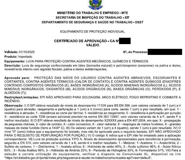 Quando se consulta o CA de qualquer EPI no site do Ministério, o principal campo que temos que conferir é o “Aprovado para”.