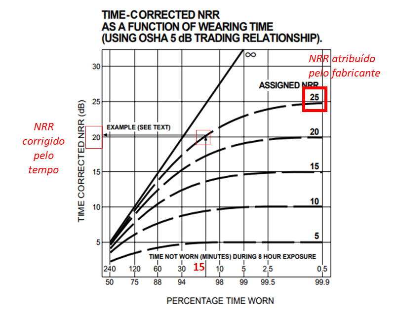 No exemplo assinalado na figura, se vê que para um protetor com NRR atribuído de 25 dB, uma omissão de 15 minutos no tempo de uso faz com que o NRR corrigido seja de apenas 20 dB!